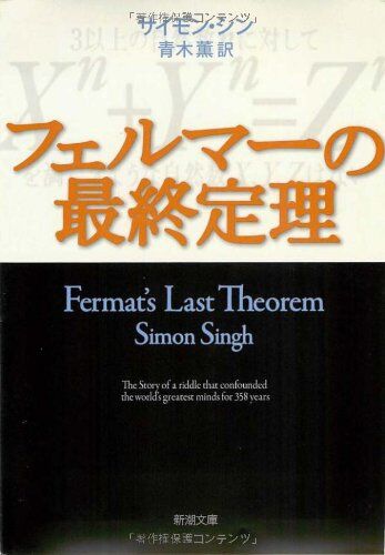 フェルマーの最終定理 (新潮文庫)作者: サイモンシン,青木薫出版社/メーカー: 新潮社発売日: 2006/05/30メディア: 文庫購入: 105人 クリック: 1,697回この商品を含むブログ (570件) を見る 非常に読みやすく解りやすく数学の世界に触れられた。 「高校あたり…